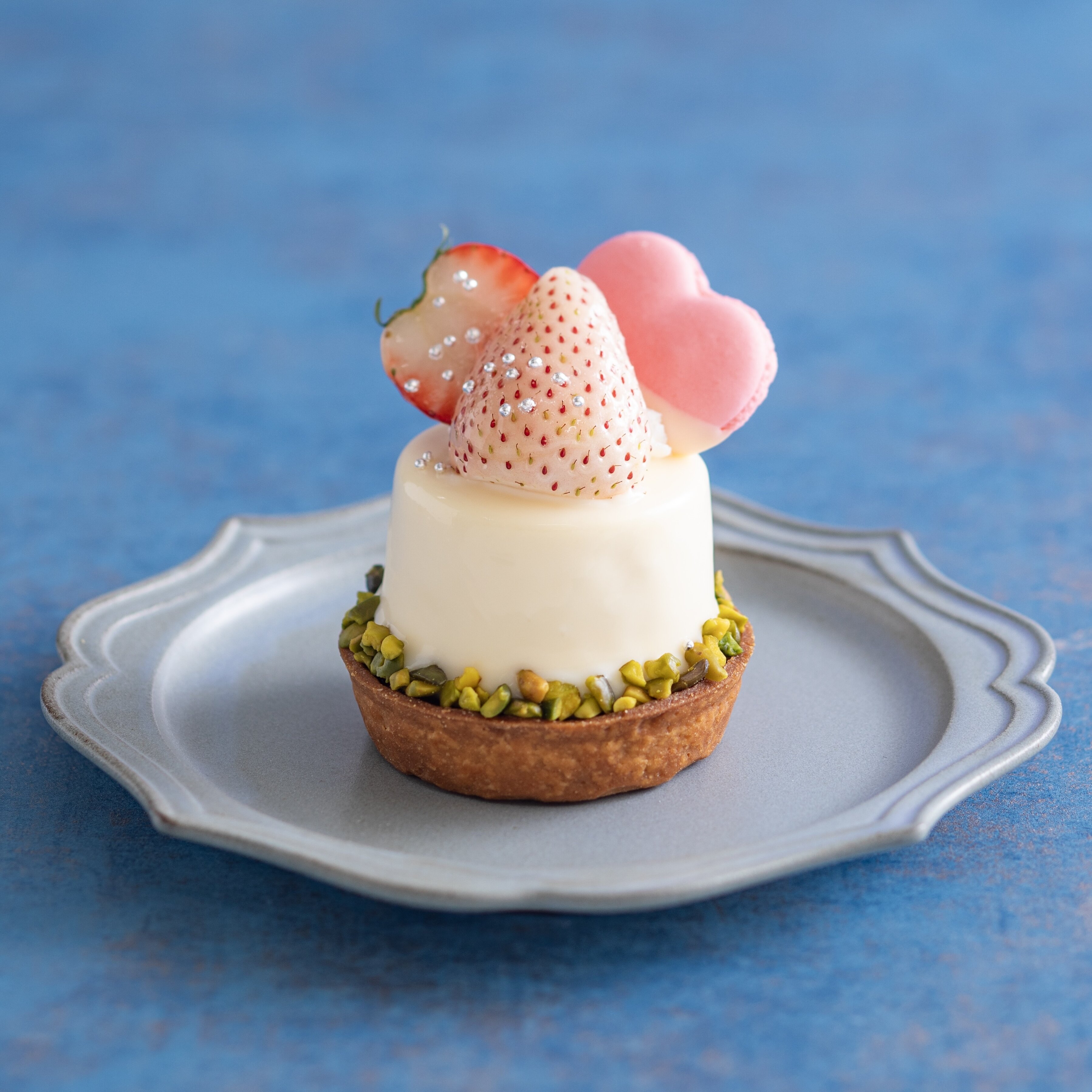 ラズベリークリームをとじ込めたホワイトチョコムースを香ばしいタルトに乗せ、2色のいちごとハートのマカロンで仕上げたホワイトデー限定商品。